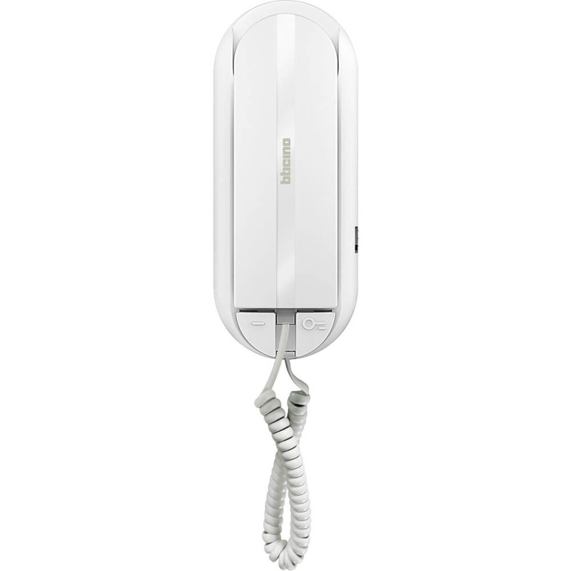 Citofono 2 FILI con cornetta (non accessoriabile) per impianti audio e misti audio/video. Installabile da parete senza ausilio di accessori. E’ dotato di pulsante apertura serratura e pulsante (configurabile) per funzioni ausiliarie. Volume suoneria regolabile su 3 livelli. Colore Bianco.