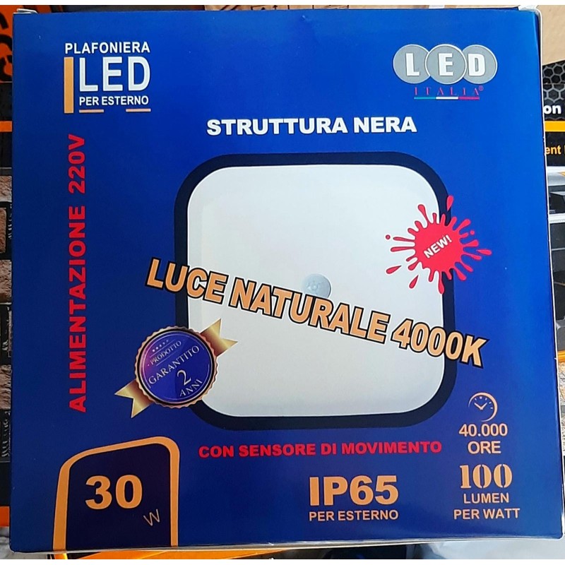 plafoniera A LED CON SENSORE DI MOVIMENTO IP65 PER ESTERNO ,LUCE NATURALE 4000K ,ALIMENTAZIONE 220V , struttura nera