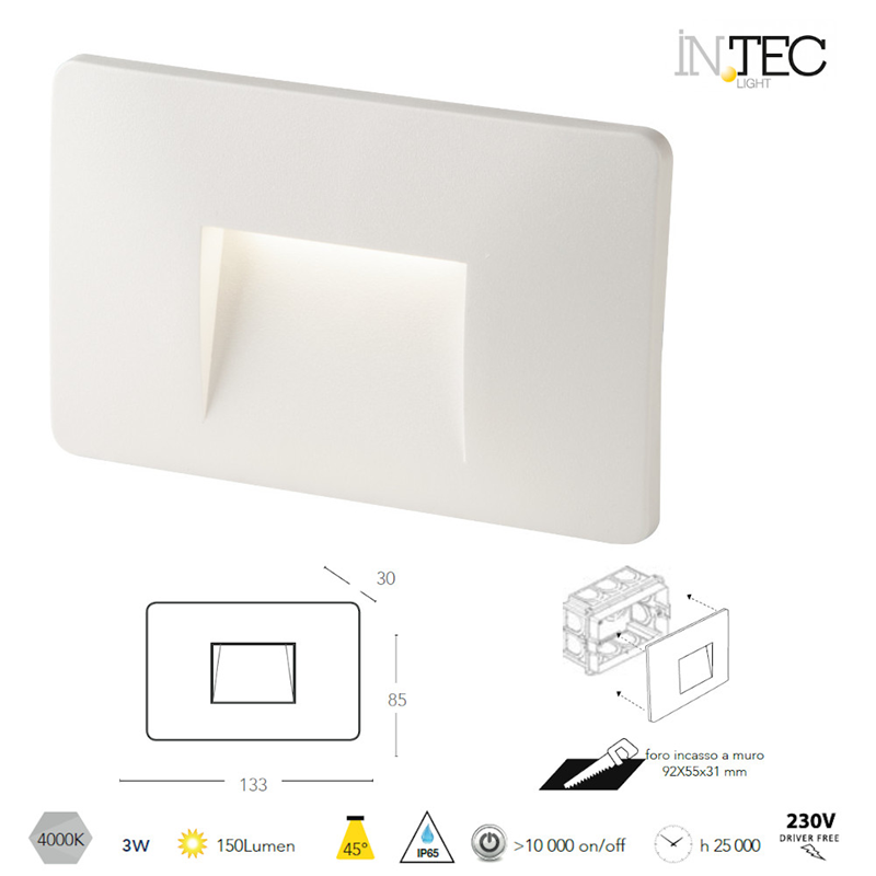 Faretto segnapasso led da incasso a parete rettangolare 3W, segnapasso alloggio cassetta derivazione 503, segnapasso da incasso led integrato bianco