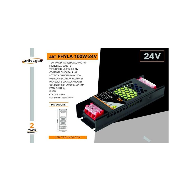 Potenza massima erogabile 100W. Input AC 200-240V, Uscita DC 24V 4.16A. Alimentatore con protezione da sovraccarichi e cortocircuiti.