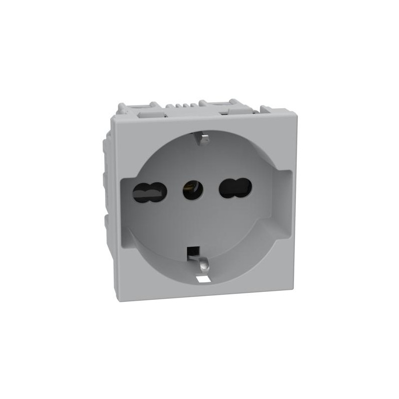 Presa 2 P+T 16 A 250 Va.c. - interasse 19 mm e 26 mm in configurazione bipasso - alveoli protetti; contatti laterali di terra per spine standard tedesco; adatta per spine standard Italia 2 P e 2 P+T 10/16 A, spine standard tedesco 2 P+T 16 A - 2 moduli - grigio