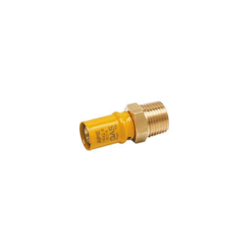 Raccordo a pressare dritto maschio per tubo multistrato. Gli articoli sono dotati di doppio o-ring di tenuta, più anello in PE per eliminare eventuali correnti vaganti. I raccordi vengono utilizzati in impianti di adduzione gas conformi alla UNI/TS 11343. Campo di temperatura: da -20°C a 70 °C – Pressione di esercizio: MOP 5 – Profili di pressata: profilo TH.