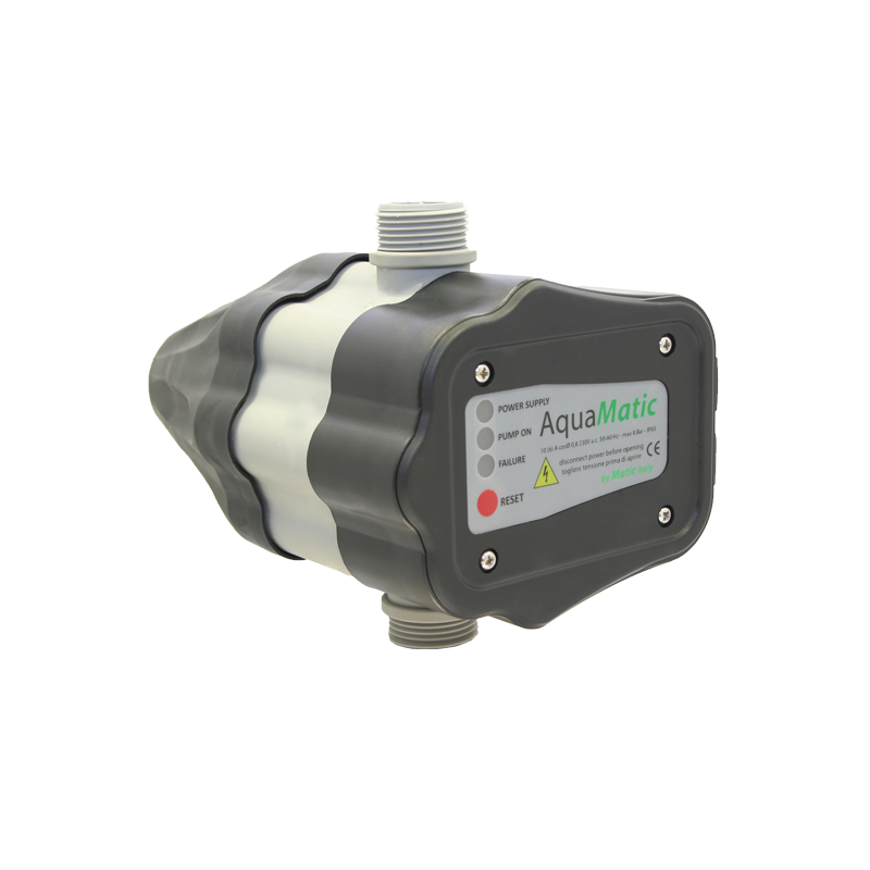 Il Presscontrol AQUAMATIC è un regolatore elettronico che avvia e spegne automaticamente la vostra elettropompa quando la pressione raggiunge 2,2 bar. Ideale per impianti domestici e autoclavi, garantisce il mantenimento della pressione e la protezione della pompa grazie al rilevamento della mancanza d'acqua, bloccando il funzionamento in caso di marcia a secco. Con la sua protezione IP65 e una portata massima di 100 L/min, rappresenta una soluzione affidabile e sicura per il controllo dell'acqua.