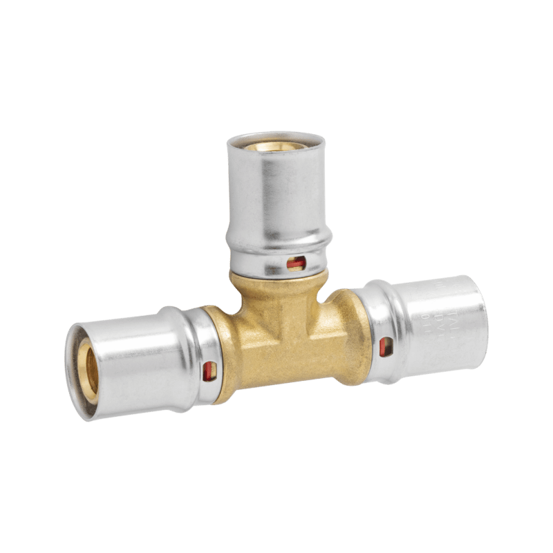 Raccordo a pressare tee per tubo multistrato. Gli articoli sono dotati di doppio o-ring di tenuta, più anello in PE per eliminare eventuali correnti vaganti. I raccordi vengono utilizzati in impianti idro-termo-sanitari. Campo di temperatura: da -25°C a 120 °C – Pressione di esercizio: max 16 bar – Profili di pressata: profilo TH