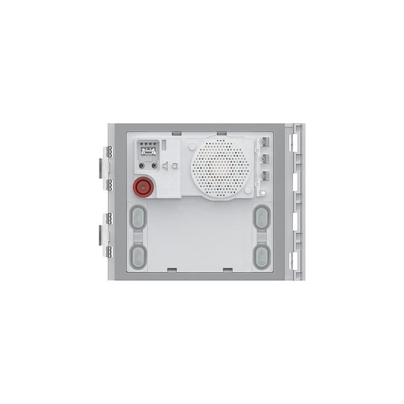 Modulo fonico per la realizzazione di impianti citofonici e videocitofonici 2 fili. Dotato di regolazioni volume altoparlante e microfono. Gestisce fino ad un massimo di 100 chiamate a pulsanti utilizzando moduli pulsanti su doppia fila aggiuntivi. Consente l'attivazione di una elettroserratura collegata direttamente ai morsetti S+ ed S- (18 V 4 A impulsivi - 250 mA mantenimento su 30 ohm max) ed il collegamento di un pulsante apriporta locale sui morsetti PL. Predisposto per alimentazione supplementare. Dotato di LED frontali per la segnalazione dello stato di funzionamento: apriporta, comunicazione attiva, chiamata